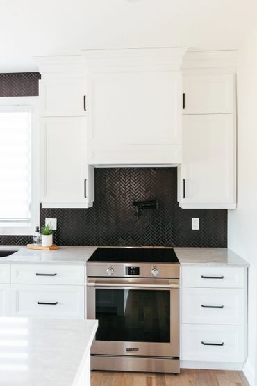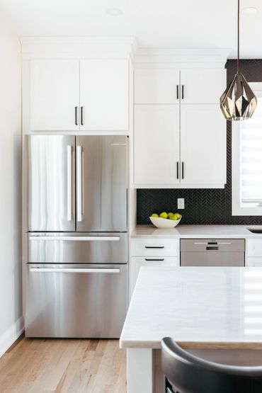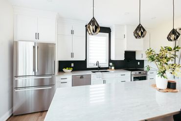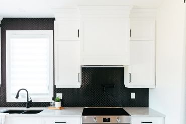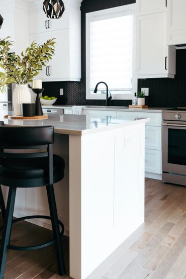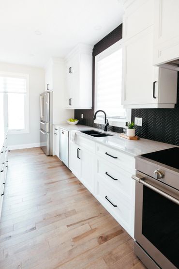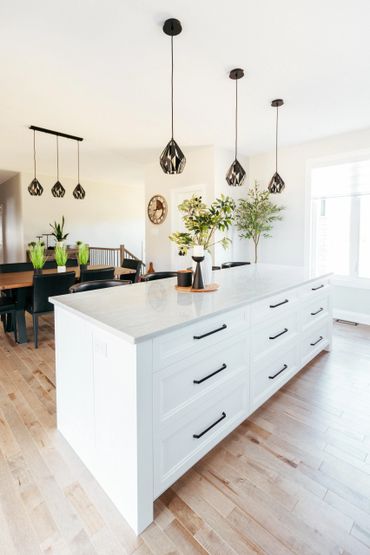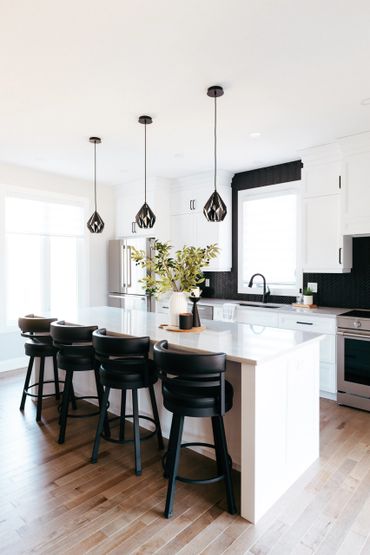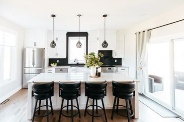 This white and black kitchen with stunning natural light, was thoughtfully designed with smart storage solutions to work around the expansive windows. A spacious functional island helps provide ample storage, featuring multiple pull-out drawers. Black hardware enhances the space, offering a striking design contrast.