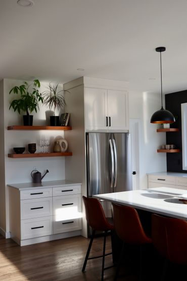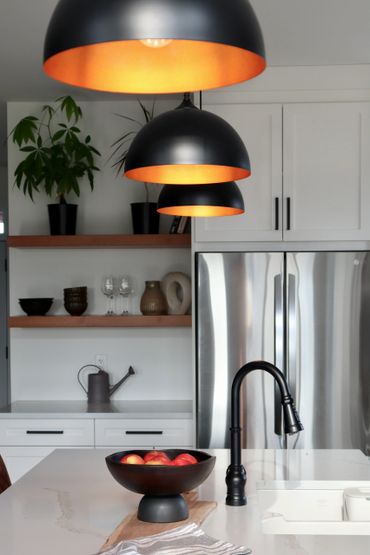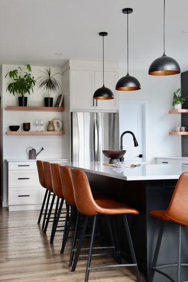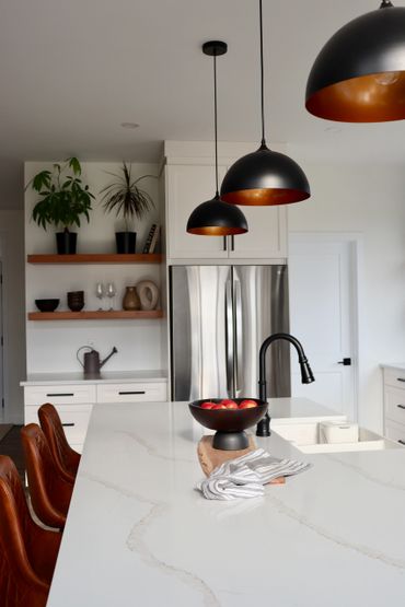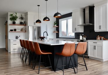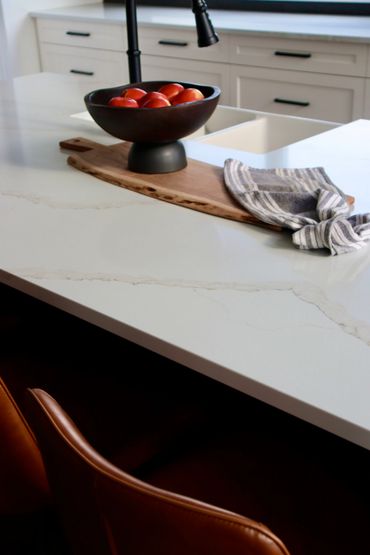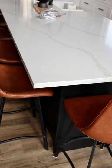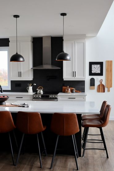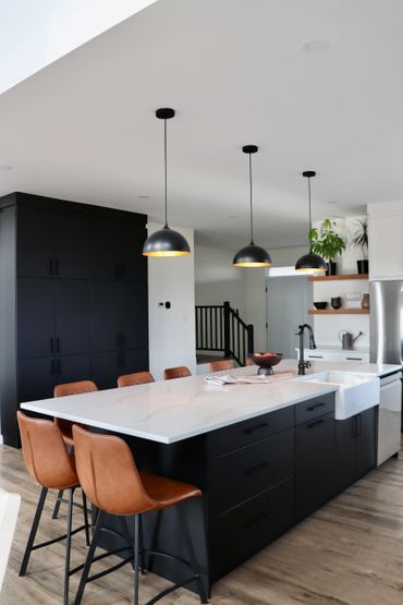 This kitchen features two tones of cabinetry. The combination of a matte black island and pantry, paired with surrounding white cabinetry adds depth and to the space. The "Calacatta gold" quartz countertop balances out the contrast of the kitchen, with coloured veining sweeping throughout the slab.