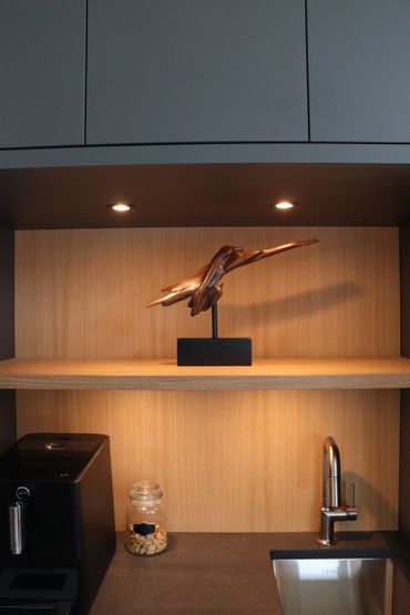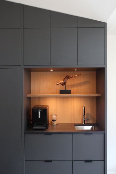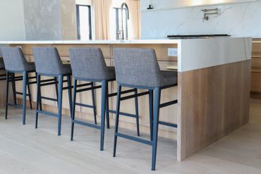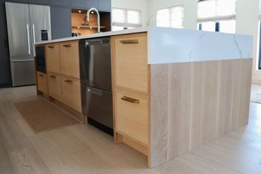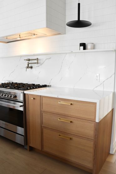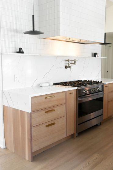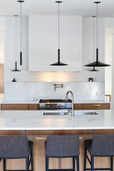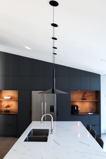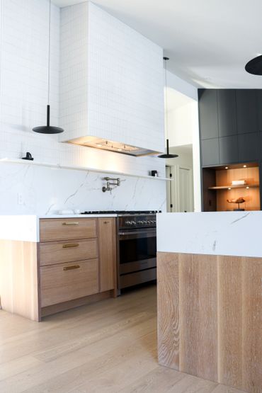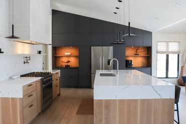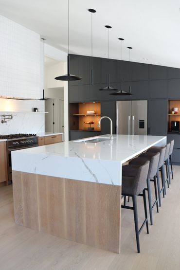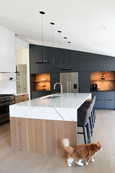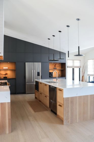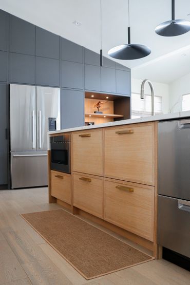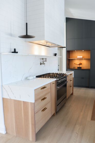 In collaboration with designer Nathan Kyle, this kitchen speaks for itself. His design combined white oak cabinets for the base and polymer silky touch cabinets along the back wall. A dramatic slanted cabinet wall adds architectural interest, truly making this space one of a kind.