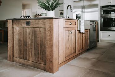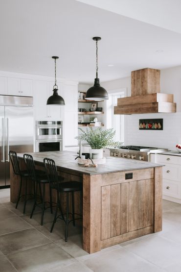 This kitchen blends rustic wood elements with modern cabinetry. The wood-paneled island and custom range hood bring warmth, while a full wall of white cabinets offers ample storage and a bright look. Floating shelves finish off the corner of the space, adding a decorative element that is equally functional storage.